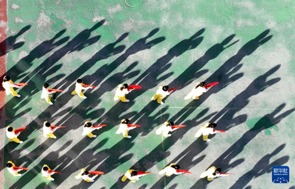 9月13日,在承德市雙橋區會龍山小學,學生練習太極扇(無人機照片)。