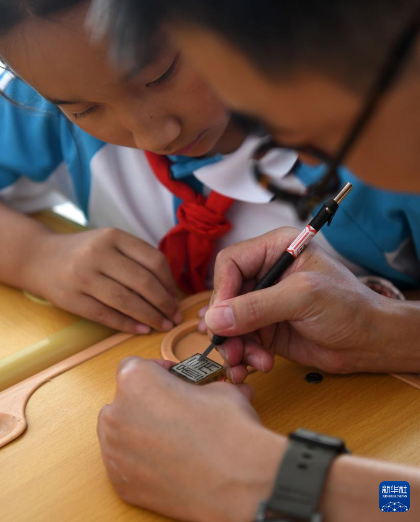 9月13日,在承德市雙橋區會龍山小學,學生在老師的指導下練習篆刻。