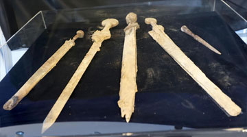 和田地區新玉歌舞團的演員在表演舞劇《五星出東方》片段(9月12日攝)。