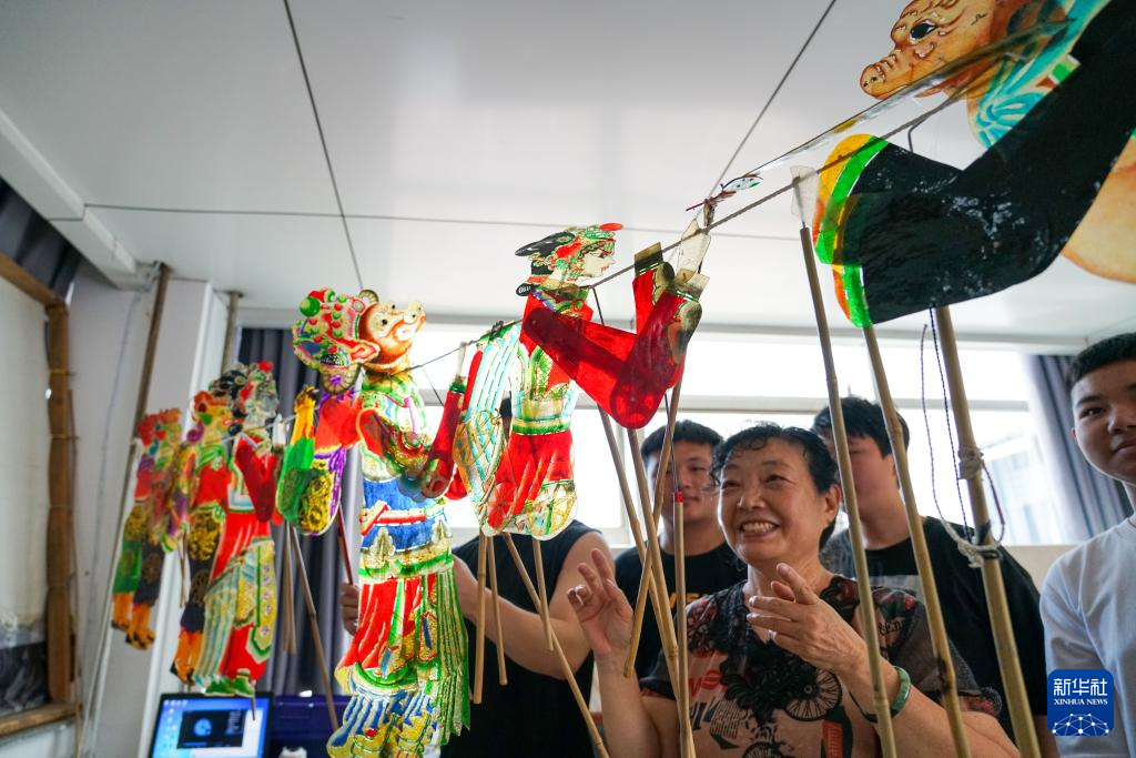 9月13日,河北省樂亭縣文化館的皮影戲藝人在皮影教室內為學生們講解皮影文化。
