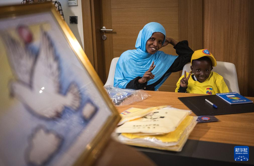 9月13日,在索馬里首都摩加迪沙,獲獎兒童卡伍基卜·穆罕默德(右)與學校教師合影。新華社記者 王冠森 攝