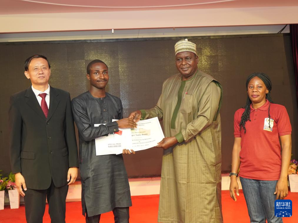 5月31日,在尼日利亞阿布賈中國文化中心,尼日利亞青年達尼亞(左二)在當天舉行的頒獎儀式上接過繪畫作品獲獎證書。