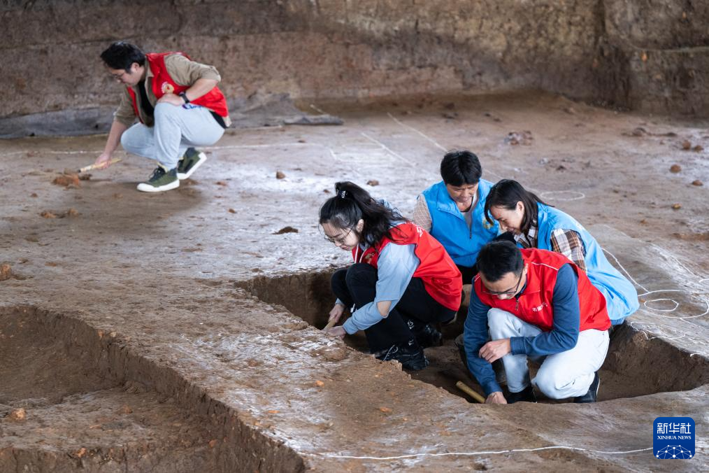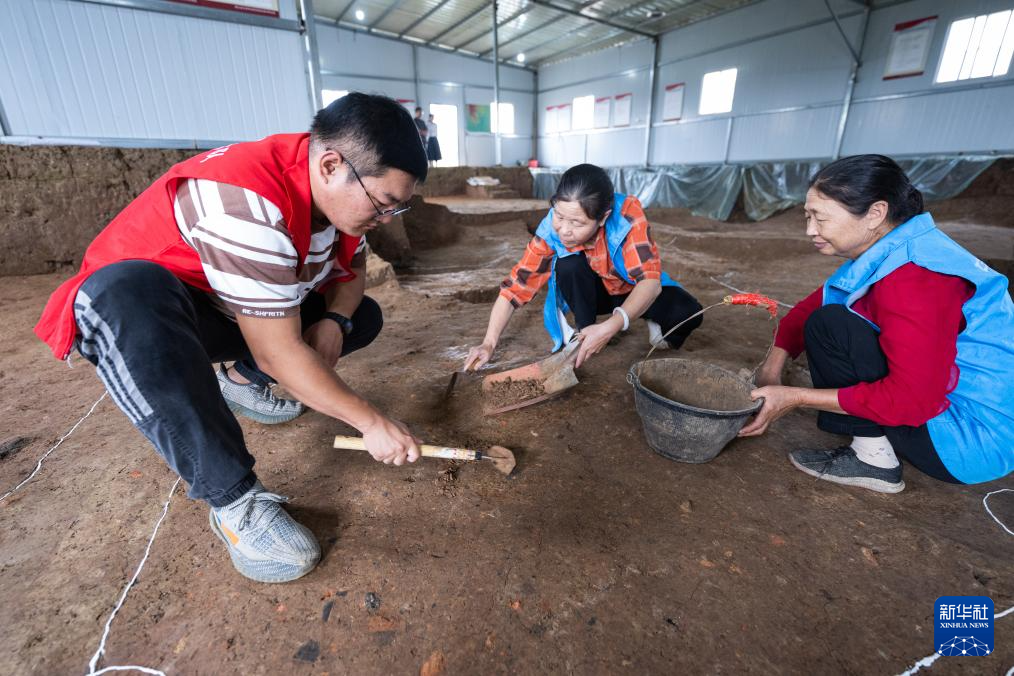 9月27日,湖北省文物考古研究院和天門市博物館的考古工作人員在石家河遺址的譚家嶺發掘現場進行考古工作。