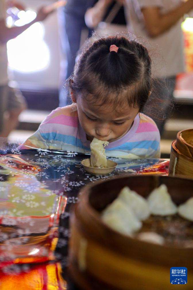 9月27日,小朋友在南翔小籠長街宴上品嘗南翔小籠。