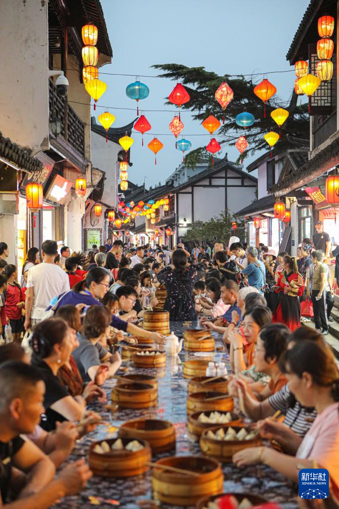 9月27日,游客在南翔小籠長街宴上品嘗南翔小籠。
