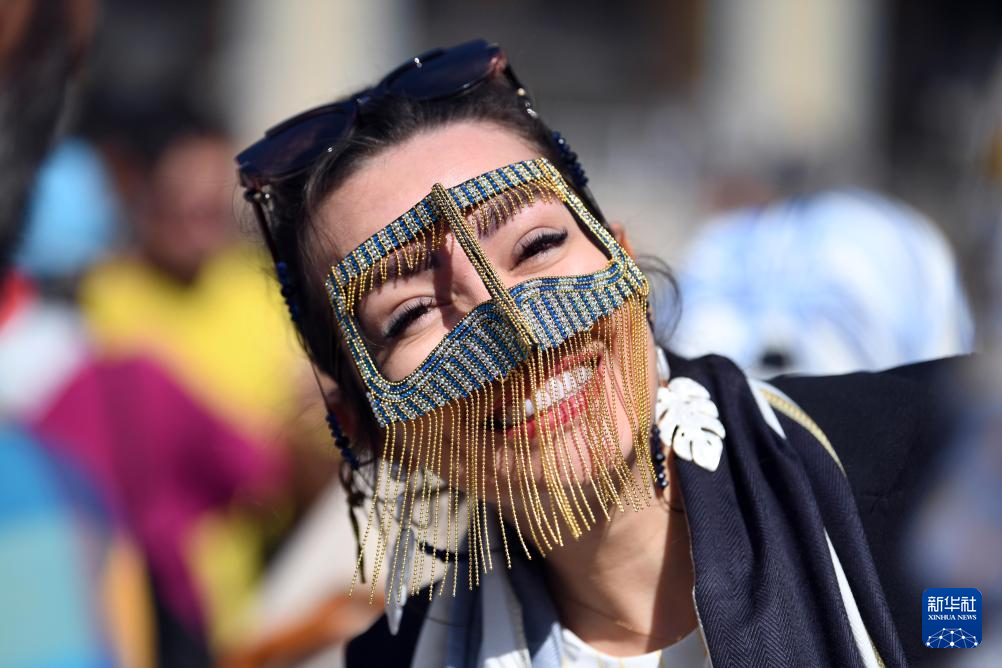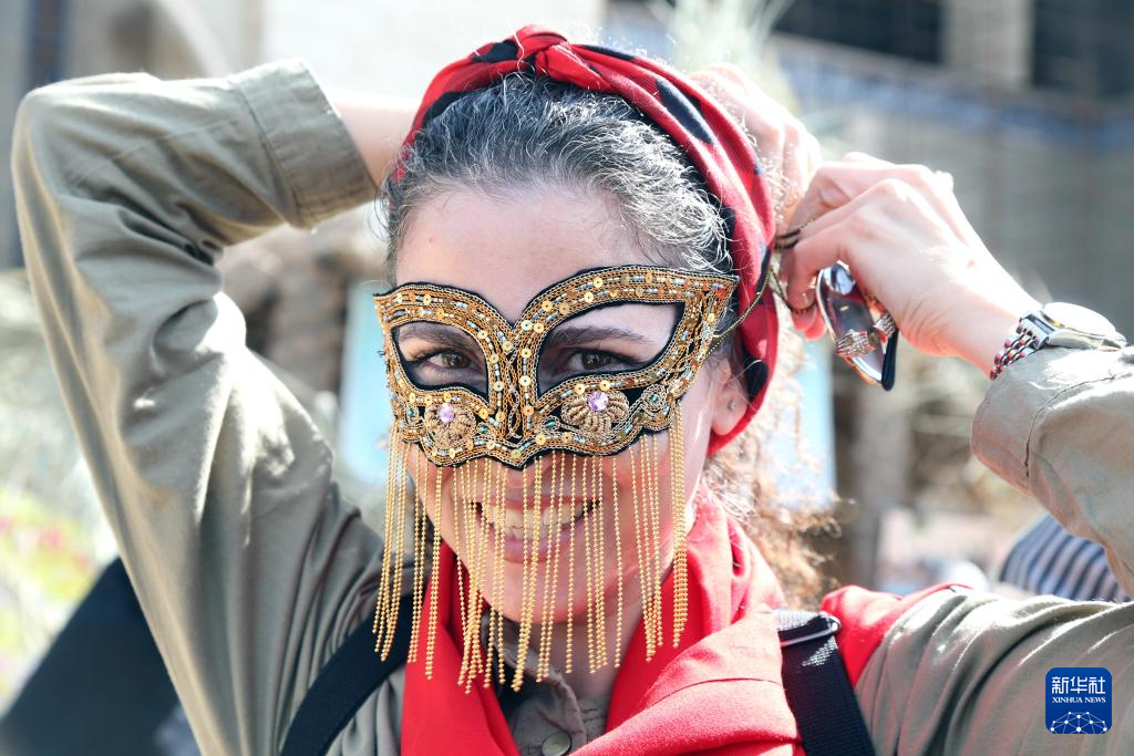 10月10日,在伊朗首都德黑蘭,一名女子試戴特色傳統面具。