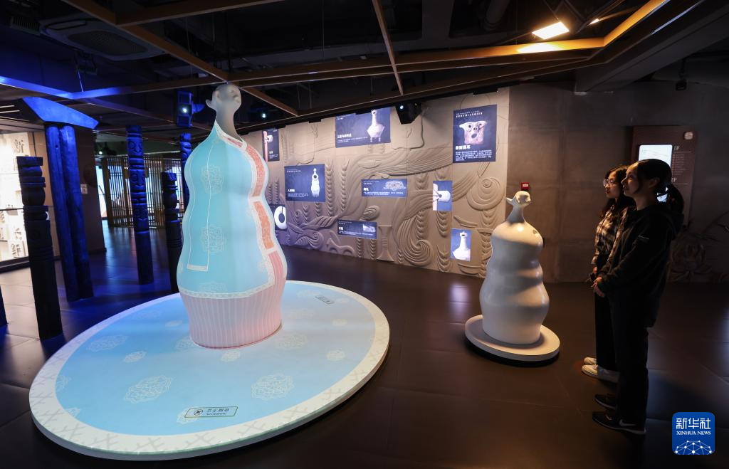10月11日拍攝的多媒體互動裝置“千源"?!扒г?以新石器時代遺址中出土的人首陶瓶造型為靈感,當游客靠近裝置,人首陶瓶上會出現不同的傳統服飾。