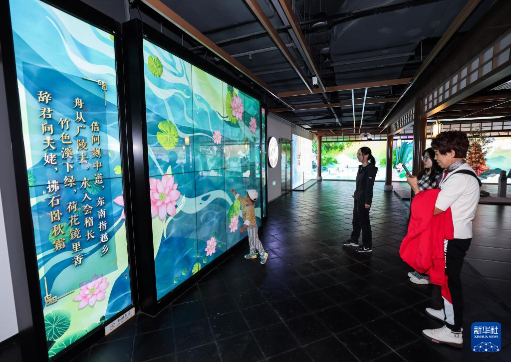 10月11日,游客在大運河數字詩路e站內觀看數字化呈現的大運河相關詩詞及景色。