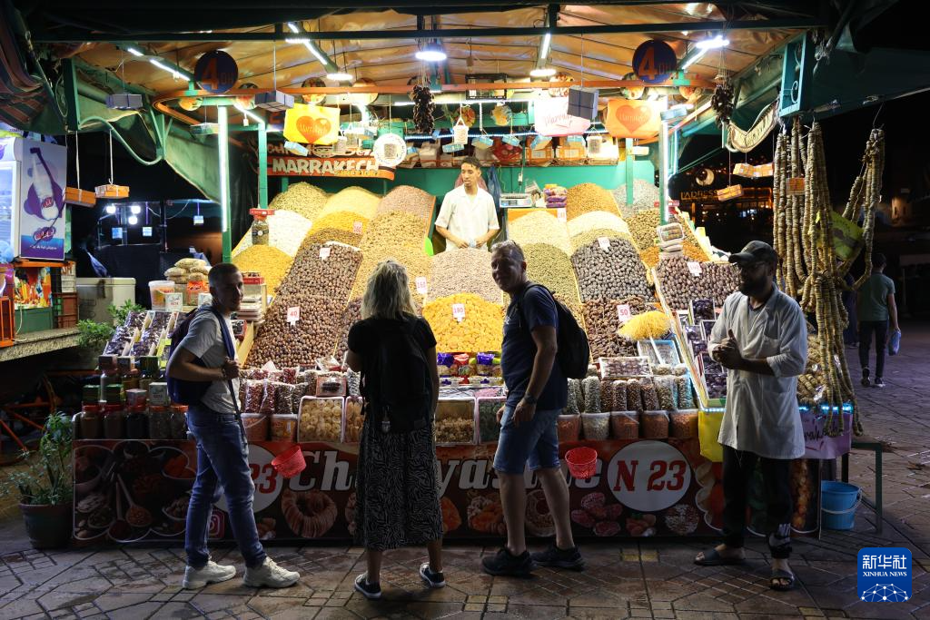 10月11日,游客在摩洛哥馬拉喀什的干果攤前駐足。