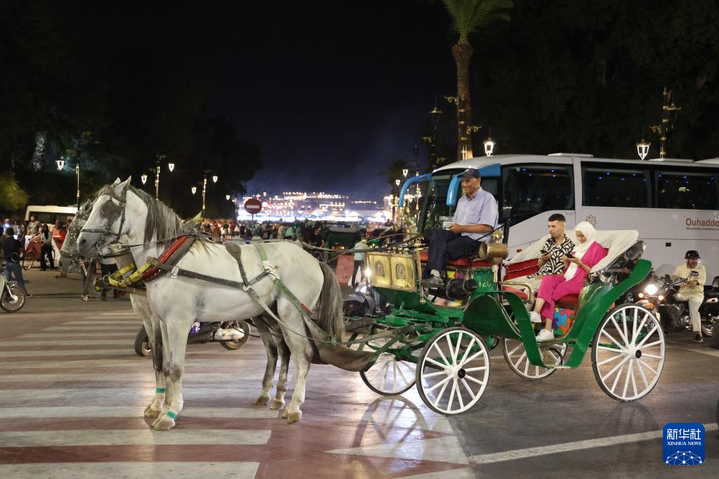 10月11日,游客在摩洛哥馬拉喀什街頭乘坐觀光馬車。