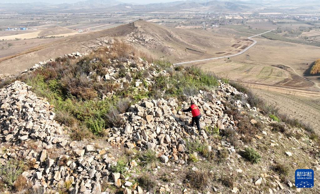 10月11日,關富軍攀上長城一座烽火臺巡查(無人機照片)。