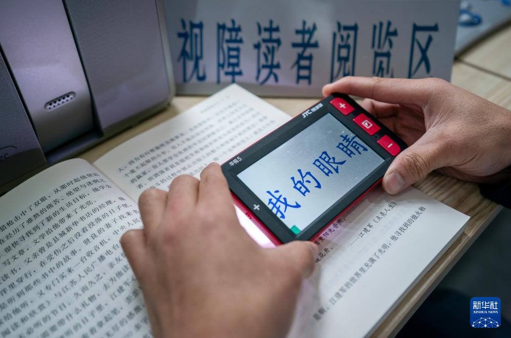 10月15日,一名視障人士在云南省圖書館視障閱覽室內使用助視器輔助閱讀。