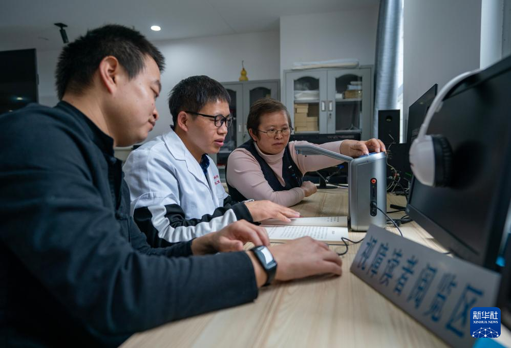 10月15日,云南省圖書館視障閱覽室工作人員楊云峰(左二)指導兩名視障人士使用紙質圖書智能閱讀器。