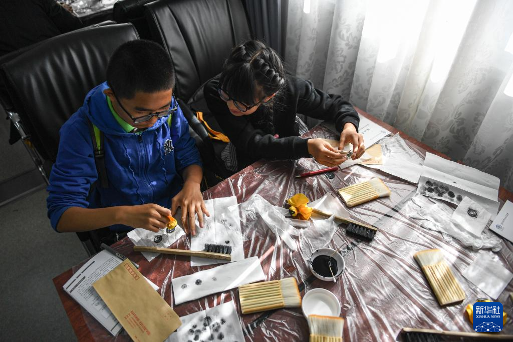 10月21日,小朋友在學習制作銅錢拓片。