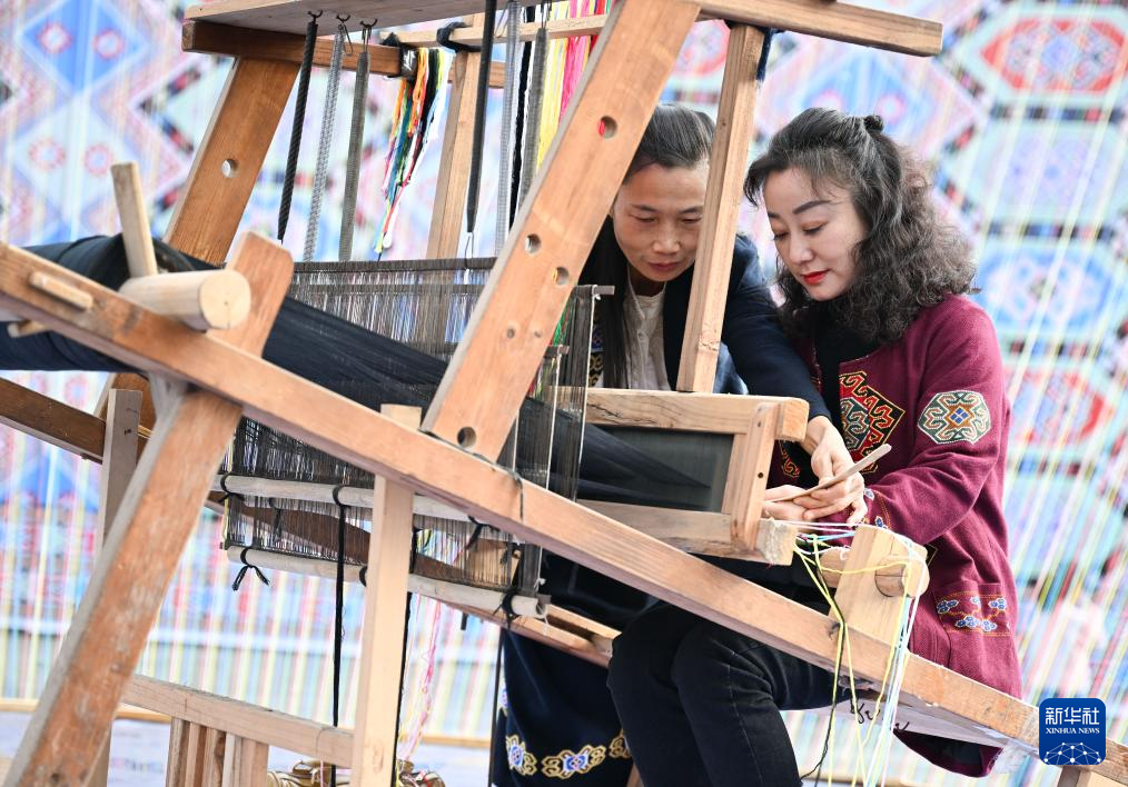 10月28日,織錦女工指導游客使用傳統織錦機進行“西蘭卡普”制作。