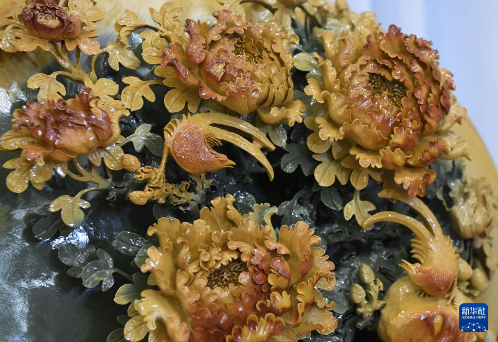 這是10月25日拍攝的柳新祥端硯作品綠端“國色天香硯”的局部。
