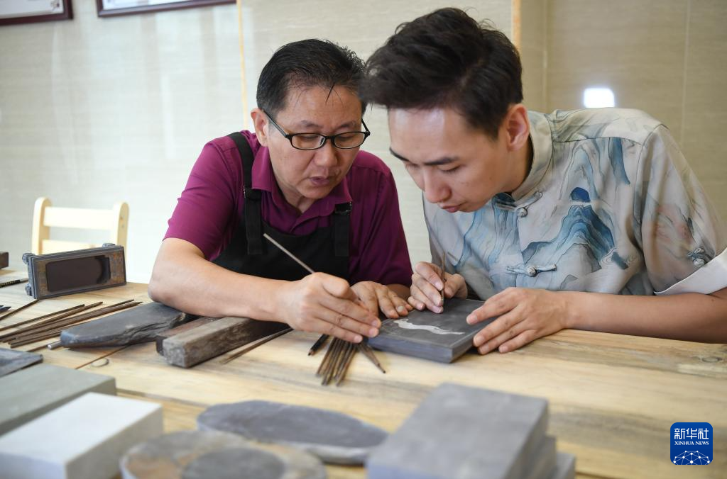 10月26日,在廣東肇慶柳新祥端硯藝術館的工作室,柳新祥(左)和兒子柳飛探討端硯制作技藝。