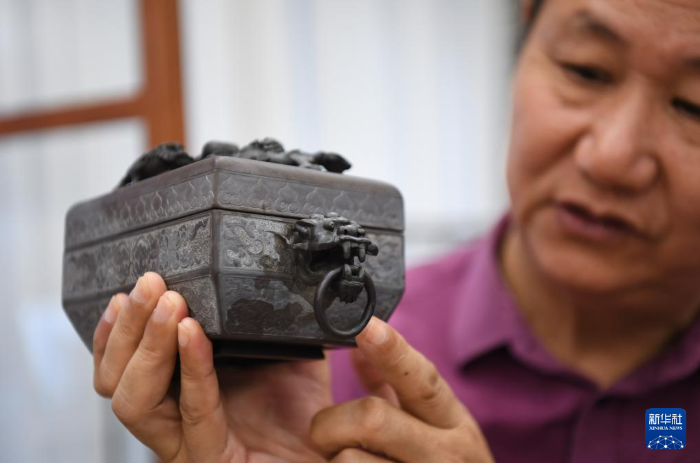 10月10日,在廣東肇慶柳新祥端硯藝術館,柳新祥講解“仿西周·簠形雙獅戲球套硯”的特點。