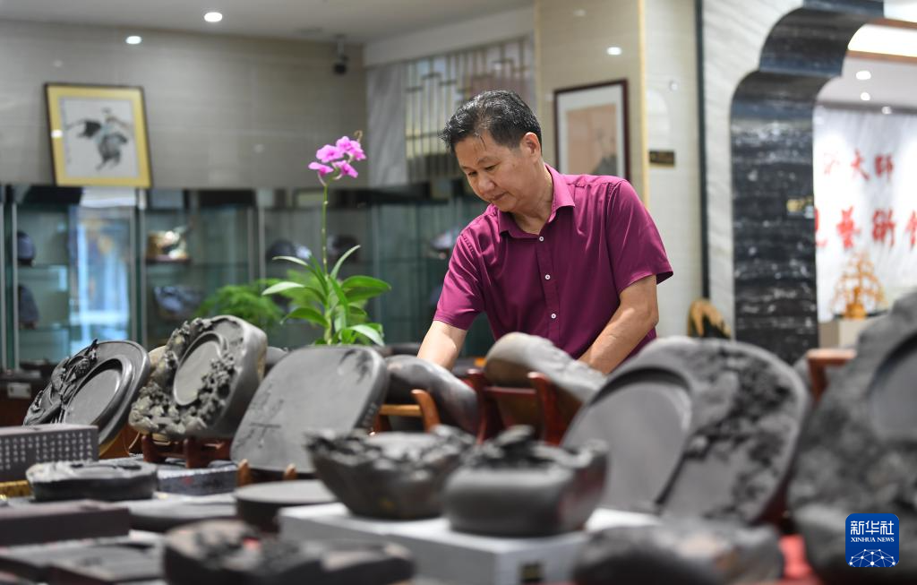 10月26日,在廣東肇慶柳新祥端硯藝術館,柳新祥在布置端硯作品。
