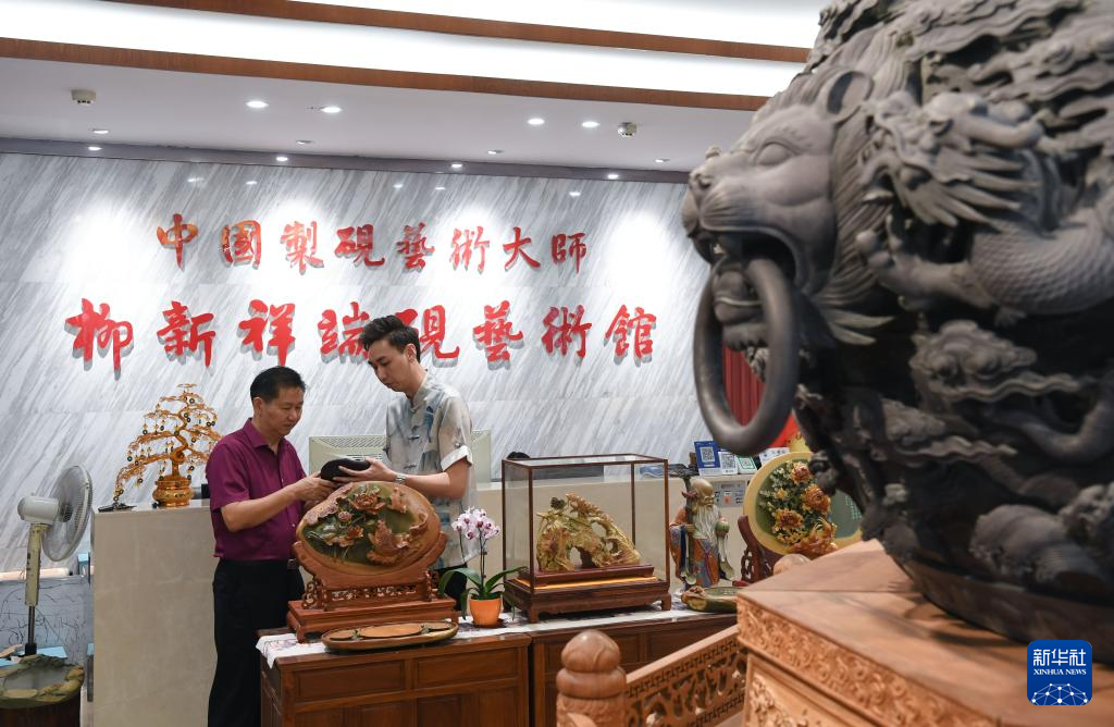 10月26日,在廣東肇慶柳新祥端硯藝術館,柳新祥(左)和兒子柳飛在討論端硯作品。