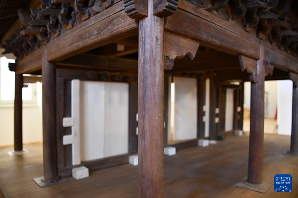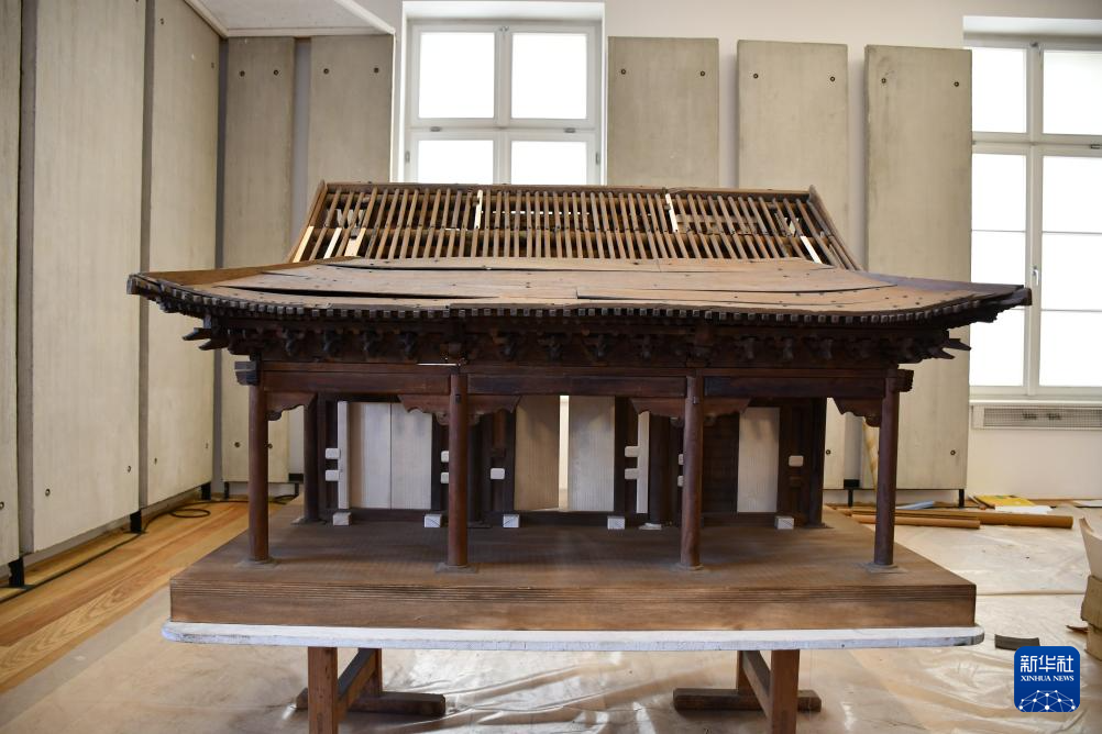 這是11月6日在斯洛文尼亞盧布爾雅那的民族志博物館拍攝的修復完成的中國古建筑木質大門模型。