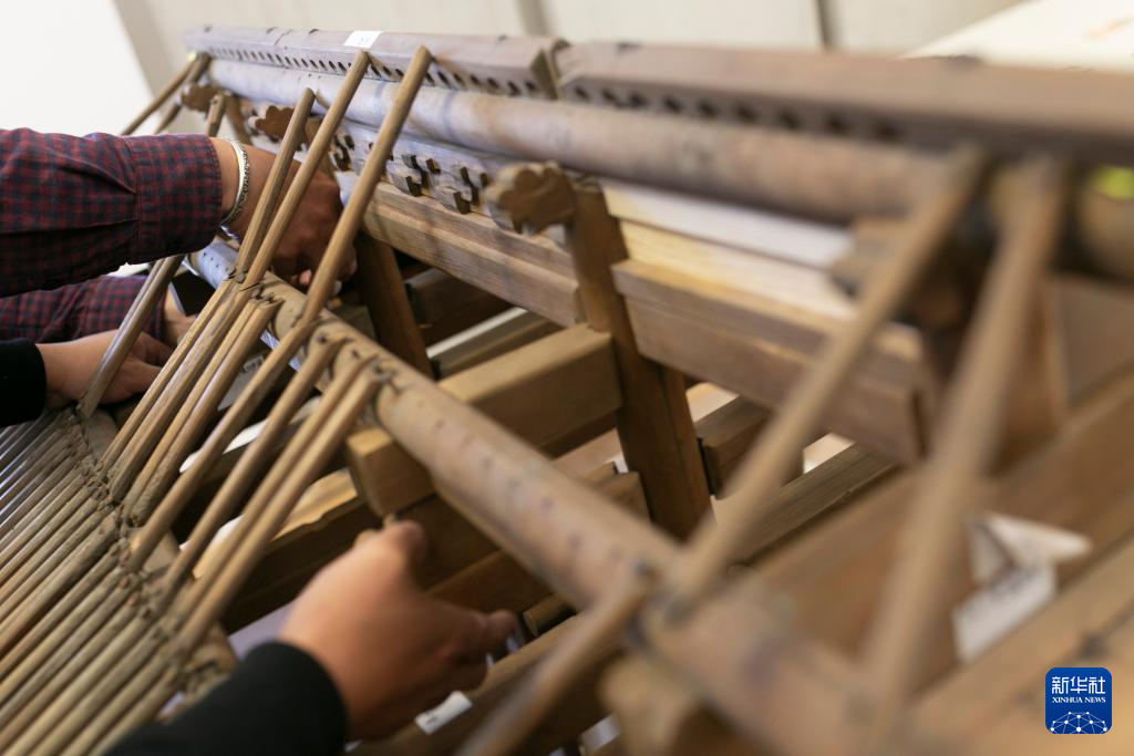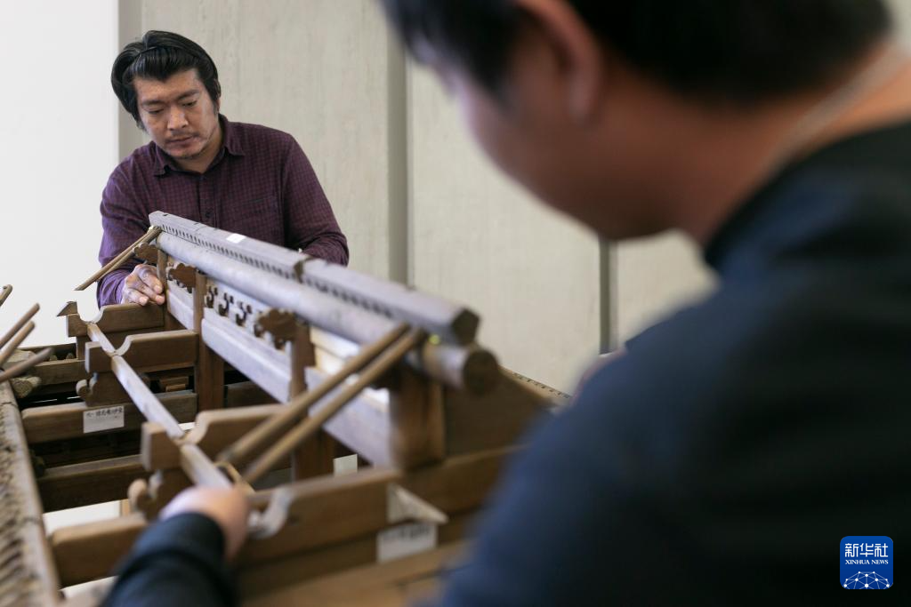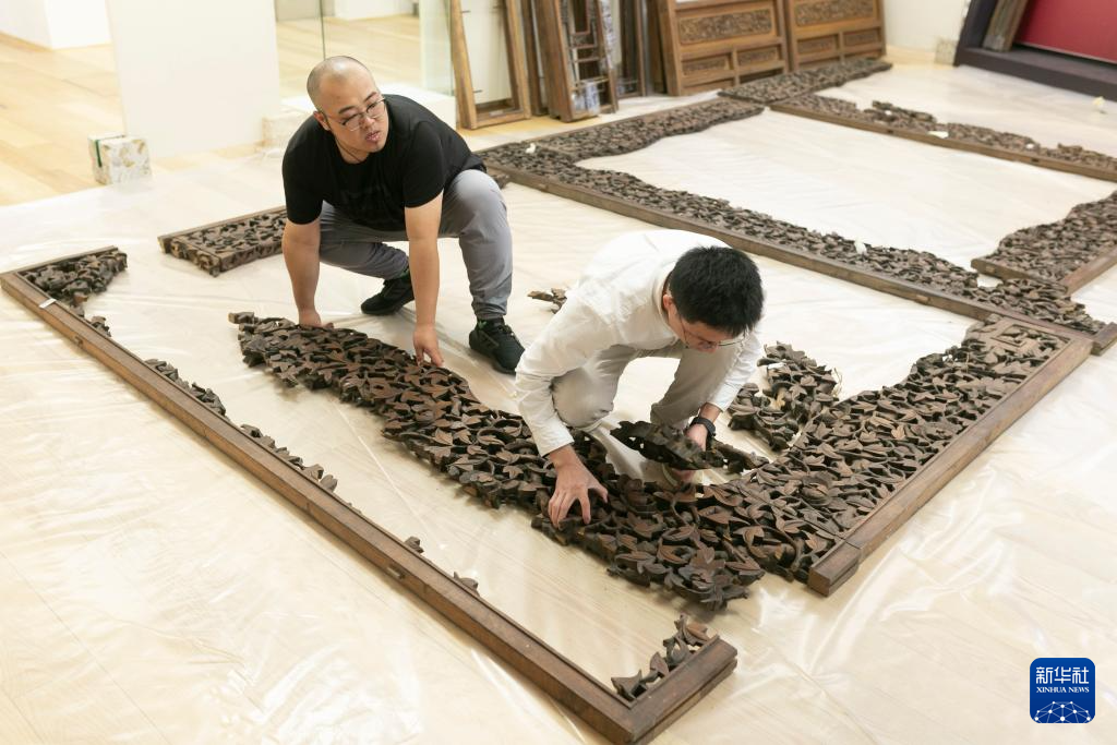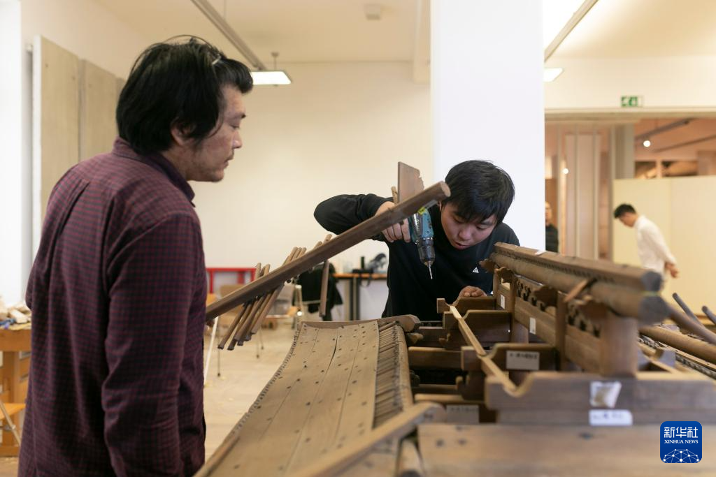 10月16日,在斯洛文尼亞盧布爾雅那的民族志博物館,故宮博物院專家侯騰龍(左)、黃齊成修復中國古建筑室內裝飾。