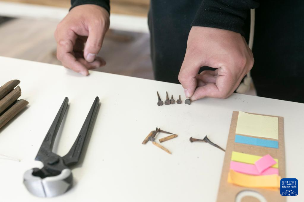 10月10日,在斯洛文尼亞盧布爾雅那的民族志博物館,故宮博物院專家鮑杰制作大門模型缺失的部件。