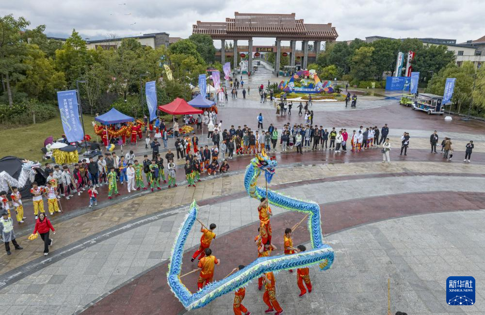 11月11日,在浙江省溫州市三垟濕地公園北廣場,舞龍隊選手在比賽中(無人機照片)。
