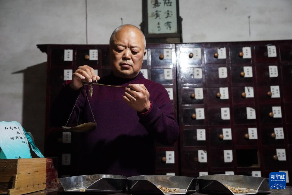 11月9日,在安徽省黃山市歙縣深渡鎮定潭村“張一帖內科療法”診所,李梃在藥房抓藥。