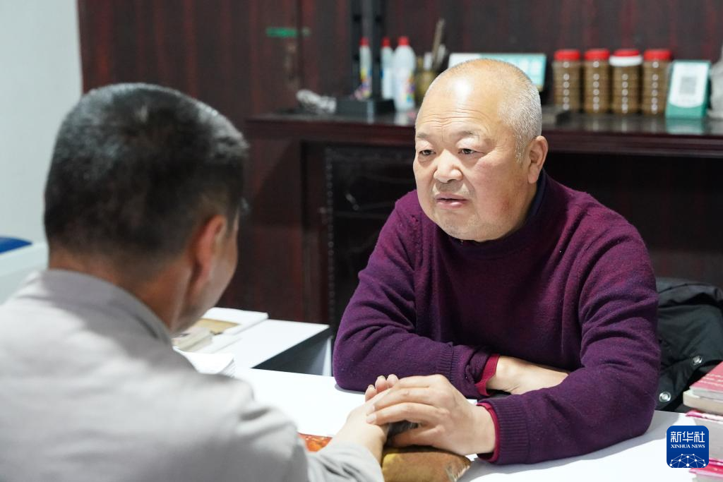 11月9日,在安徽省黃山市歙縣深渡鎮定潭村“張一帖內科療法”診所,李梃(右)為村民問診。