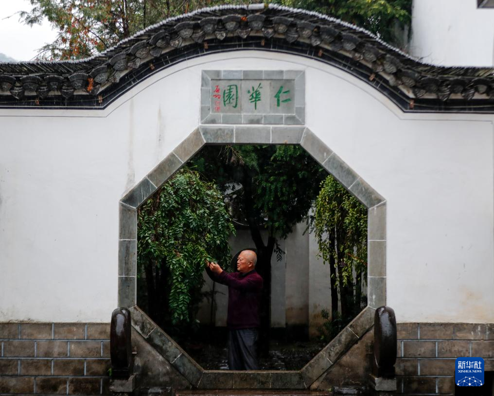 11月9日,在安徽省黃山市歙縣深渡鎮定潭村新安國醫博物館,李梃查看藥用植物生長情況。