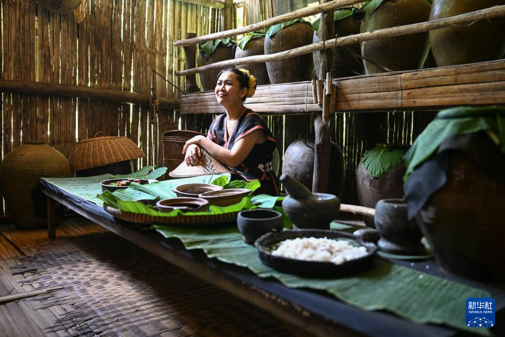 11月14日,在馬來西亞沙巴州的馬里馬里文化村,一名身著傳統民族服飾的女子制作糯米酒。