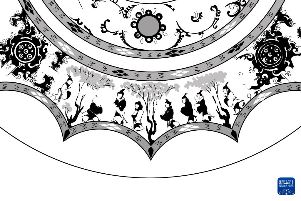 西漢彩繪人物車馬鏡局部彩繪圖案“宴飲”(8月25日攝)。