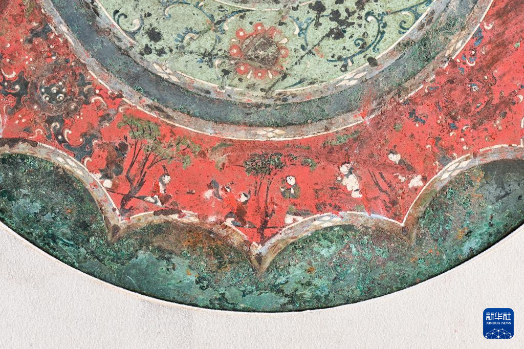 銅鏡是古代妝容工具,具有重要的藝術和科學價值,彩繪銅鏡是銅鏡中的珍品。1963年在陜西西安紅廟坡村出土的西漢彩繪人物車馬鏡,距今已有2000多年歷史,色澤艷麗,精美絕倫,被視為中國古代彩繪銅鏡代表作之一,入選國家文物局發布的《第三批禁止出境展覽文物目錄》。