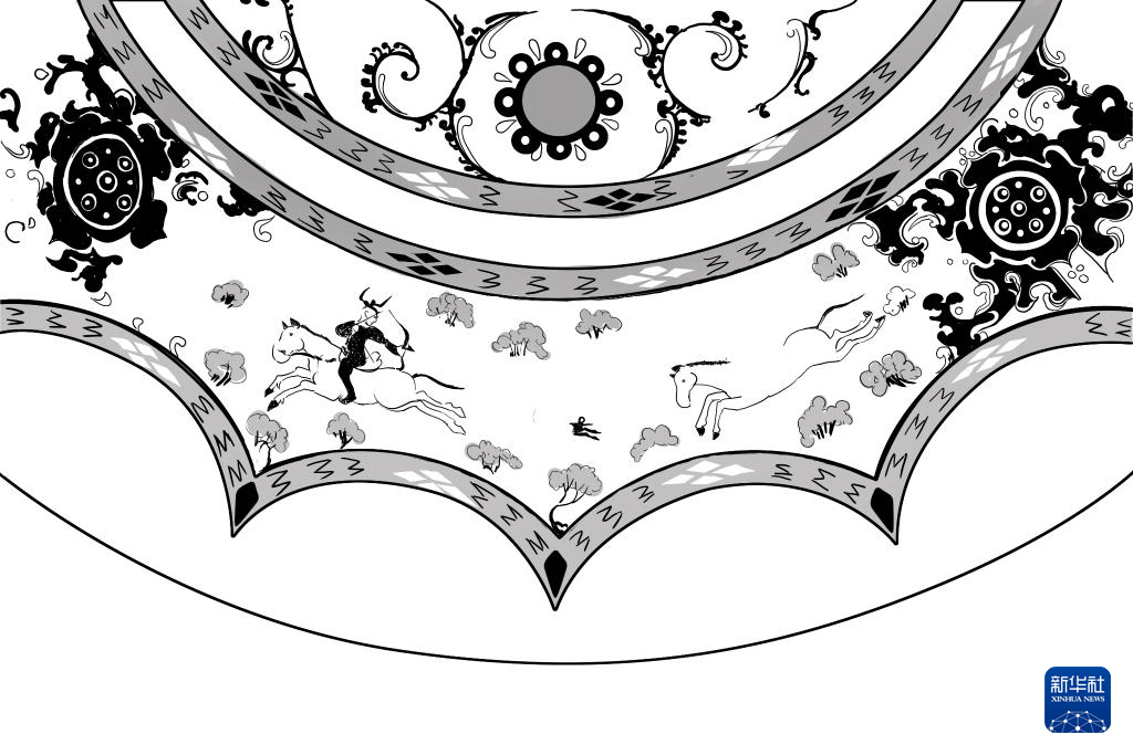 西漢彩繪人物車馬鏡局部“狩獵”圖案線稿圖。