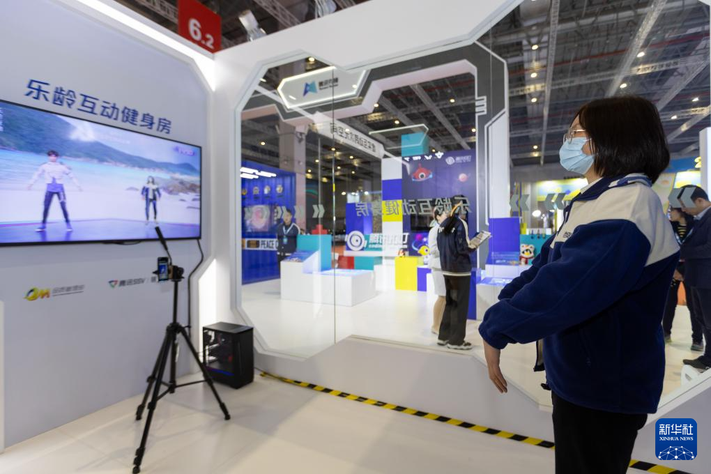 11月16日,人們在騰訊展位體驗虛擬健身房運動。
