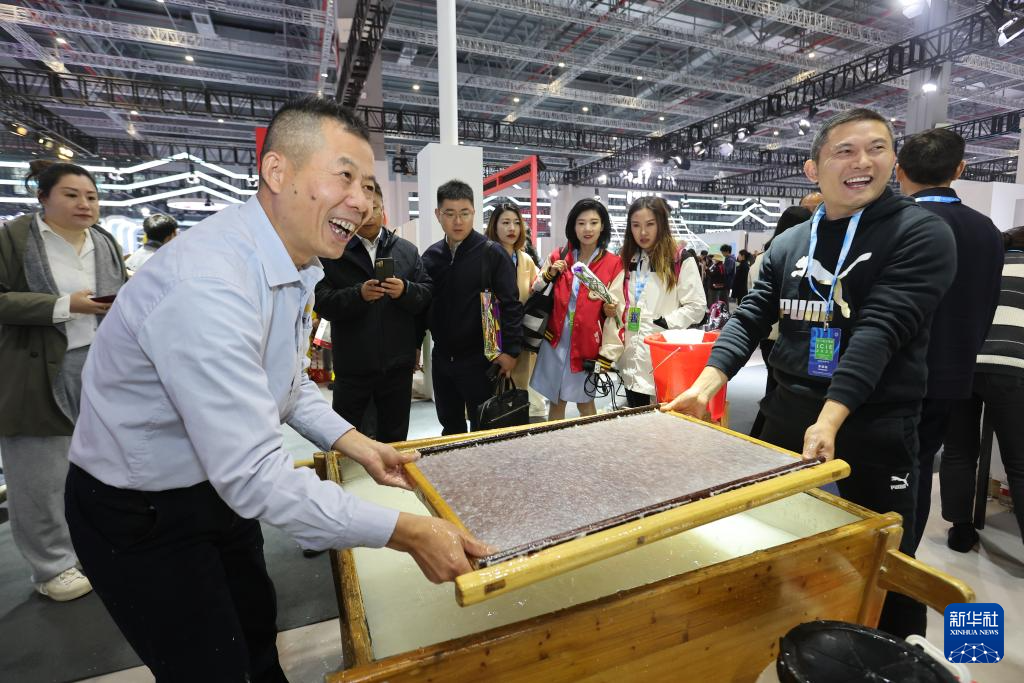 11月16日,在安徽展區,人們在師傅(左)的指導下現場體驗宣紙制作。