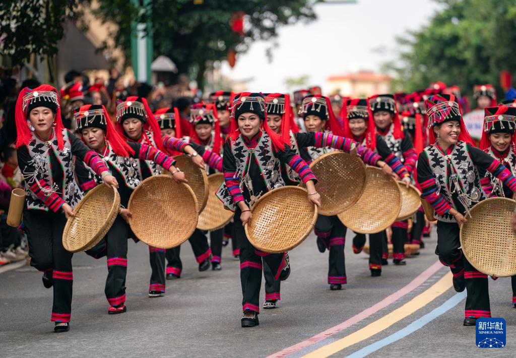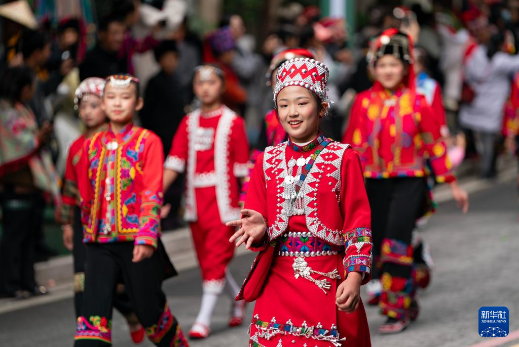11月19日,綠春縣哈尼族群眾參加哈尼長街古宴巡游展演。