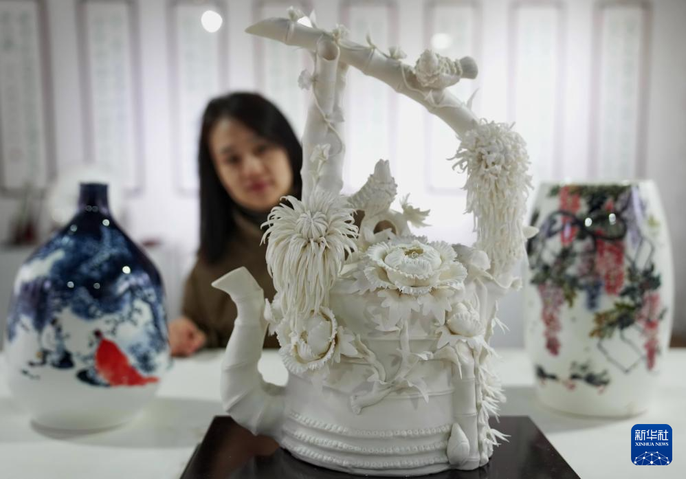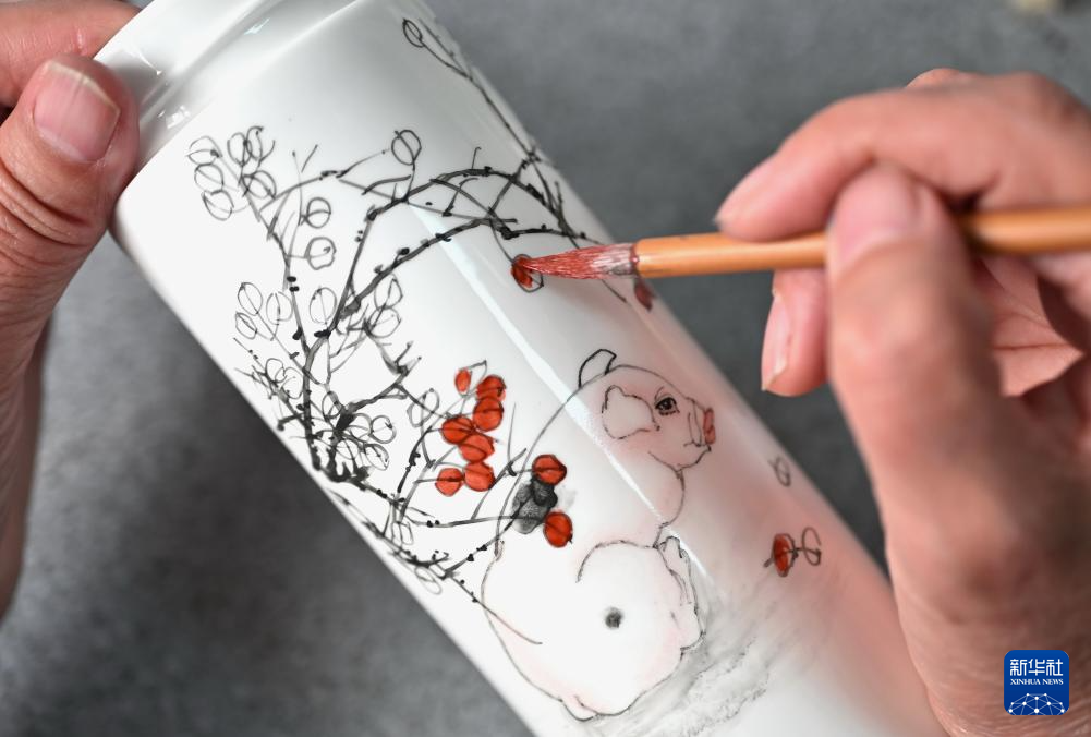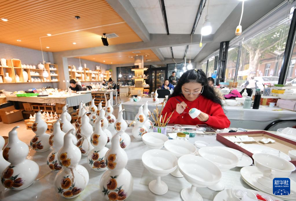 11月21日,一位工藝美術師在唐山市開平區陶瓷文創產業園創作陶瓷繪畫作品。