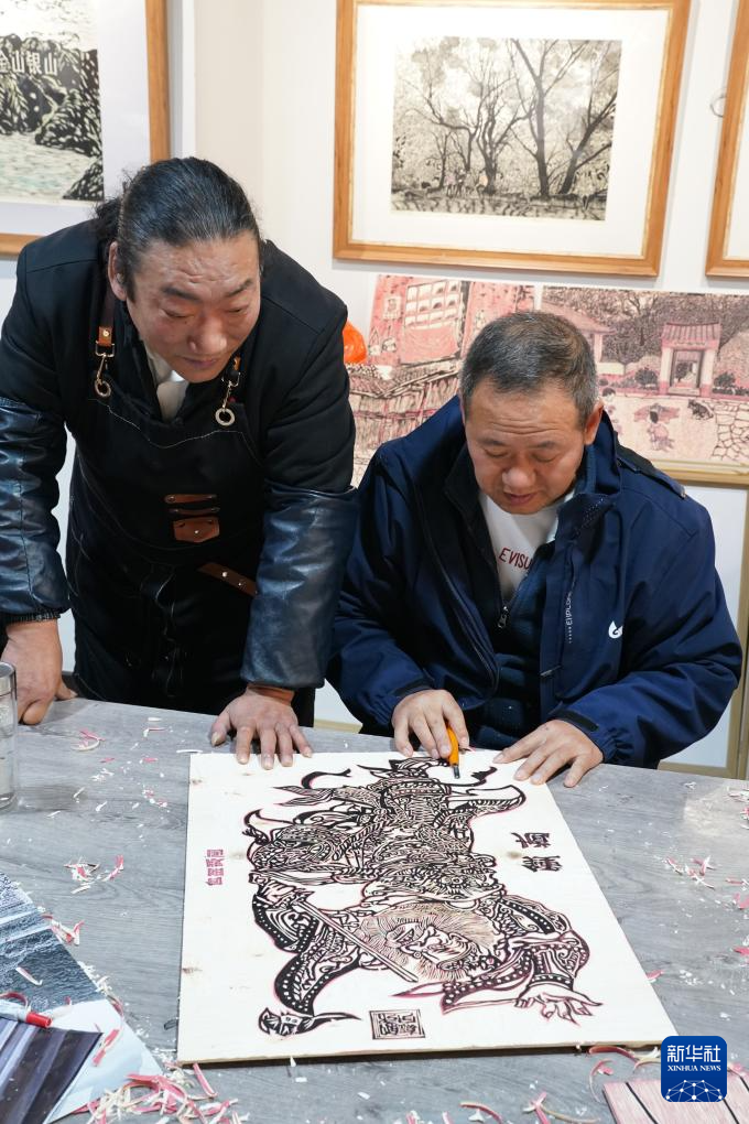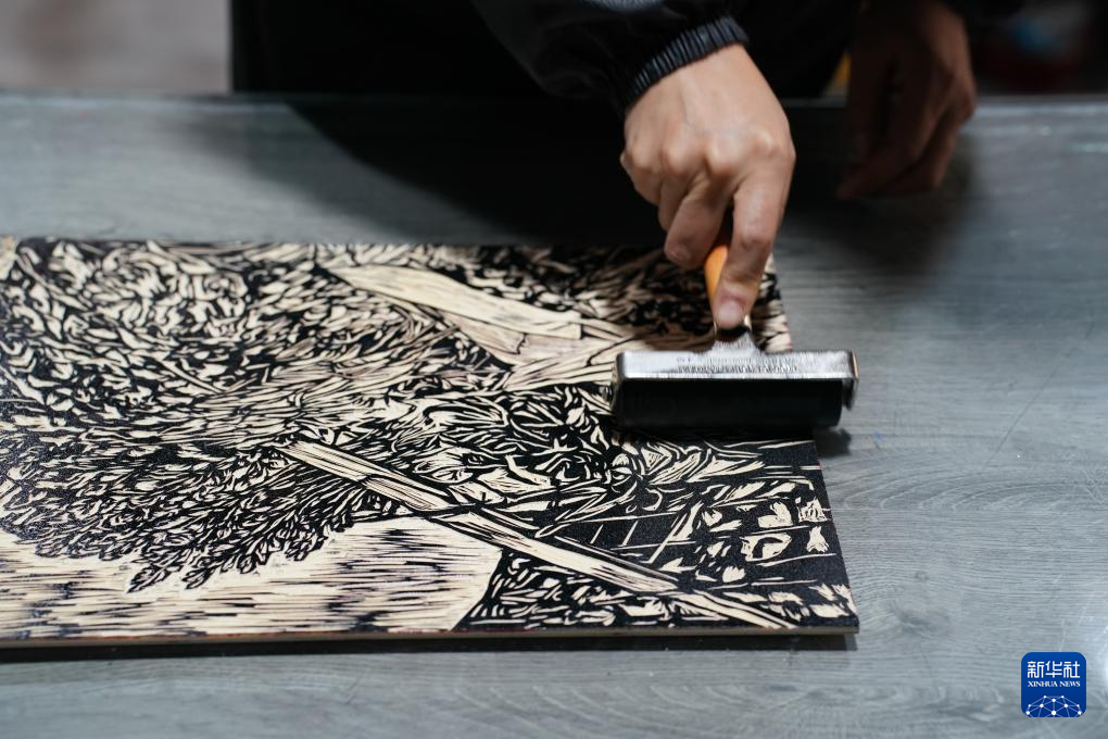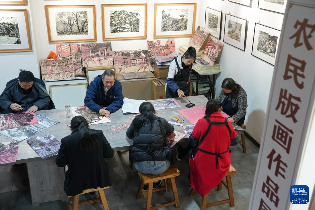 11月22日,農民版畫合作社社員和老師在旬陽市版畫院內刻版創作。
