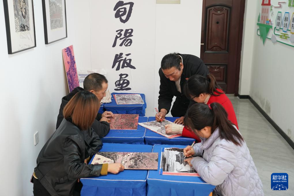 11月22日,旬陽市版畫院院長蔚世生(右一)在指導農民版畫合作社社員創作。