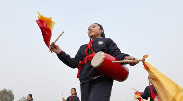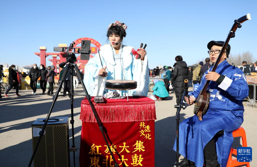 11月28日,東北大鼓非物質文化遺產傳承人王艷娟(左)在紅旗大集上表演。