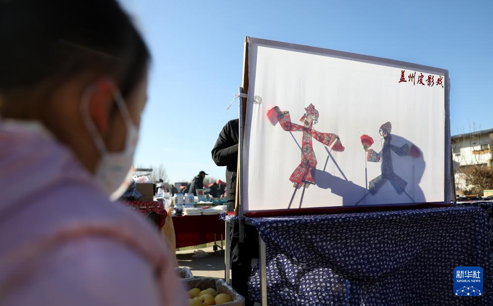 11月28日,一名小朋友在紅旗大集上觀看營口蓋州皮影戲。