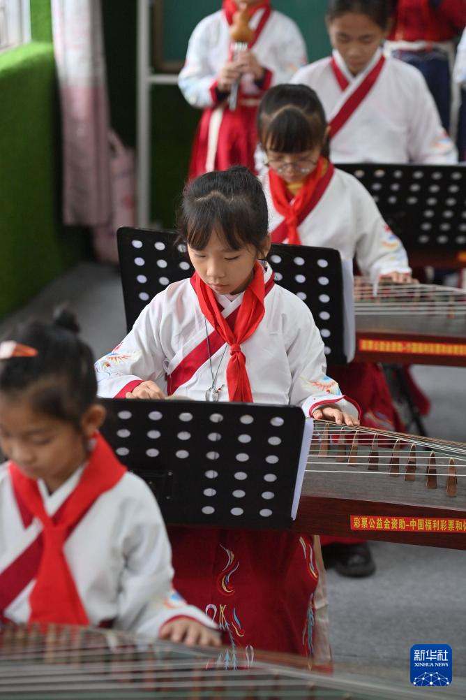 12月6日,廣西梧州市藤縣濛江鎮中心校學生在課堂上練習古箏。