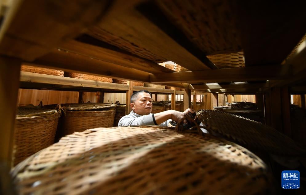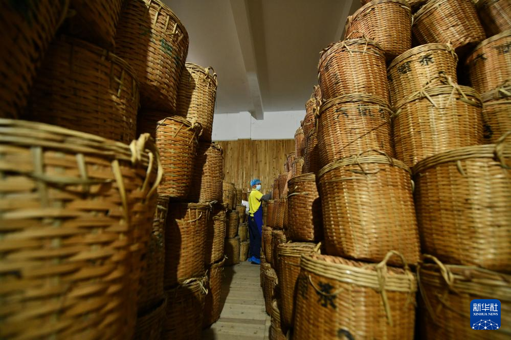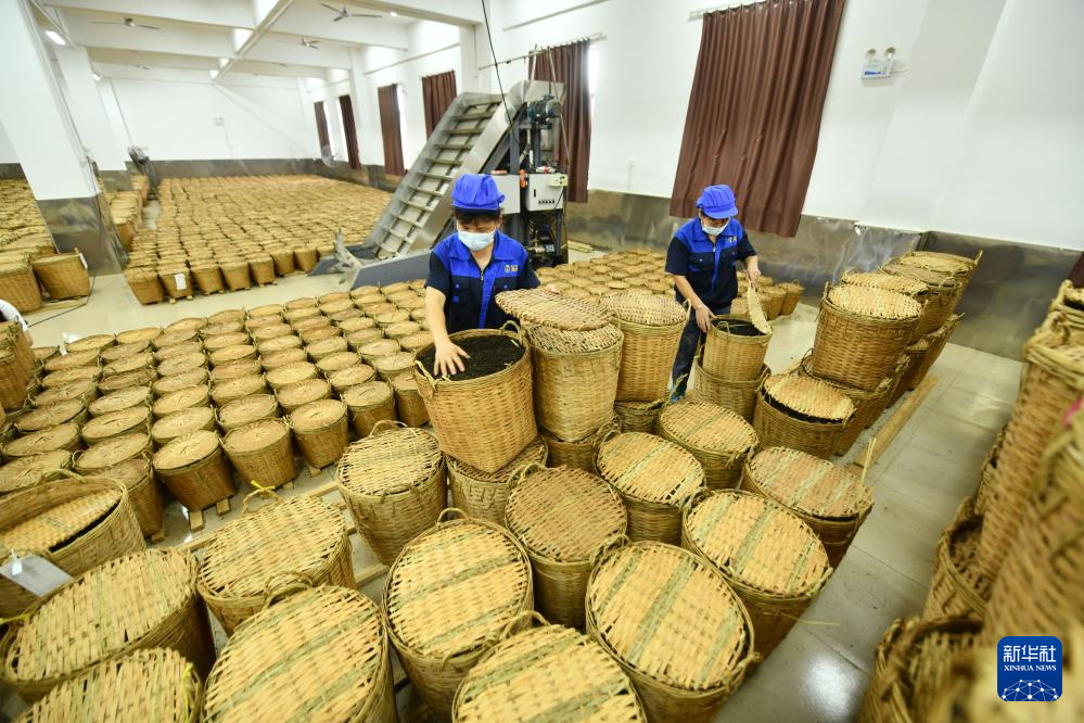 在梧州芙葉茶葉股份有限公司,工人在陳化倉作業(6月8日攝)。
