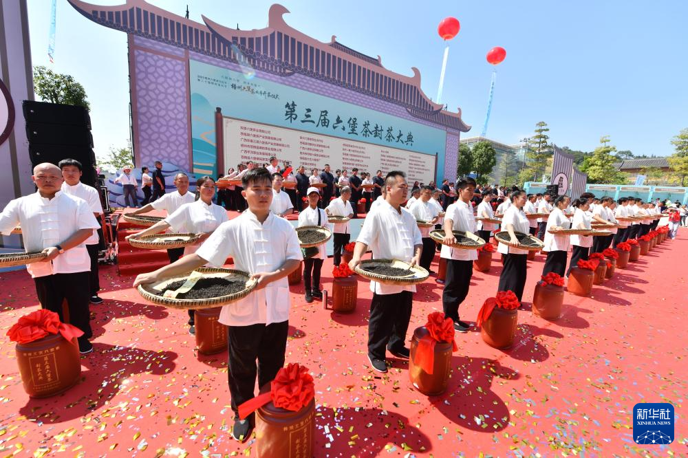 在梧州市蒼梧縣六堡鎮六堡茶文化廣場,當地制茶人參加封茶儀式(10月15日攝)。