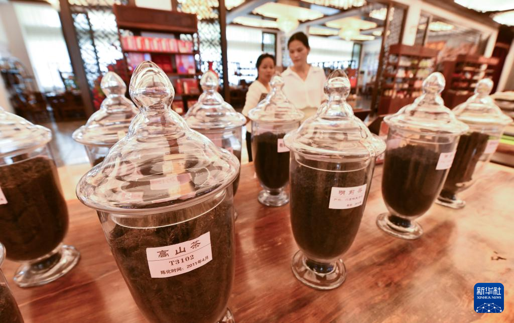 在梧州市天譽茶業有限公司產品展示廳,消費者在選購陳年六堡茶(8月25日攝)。