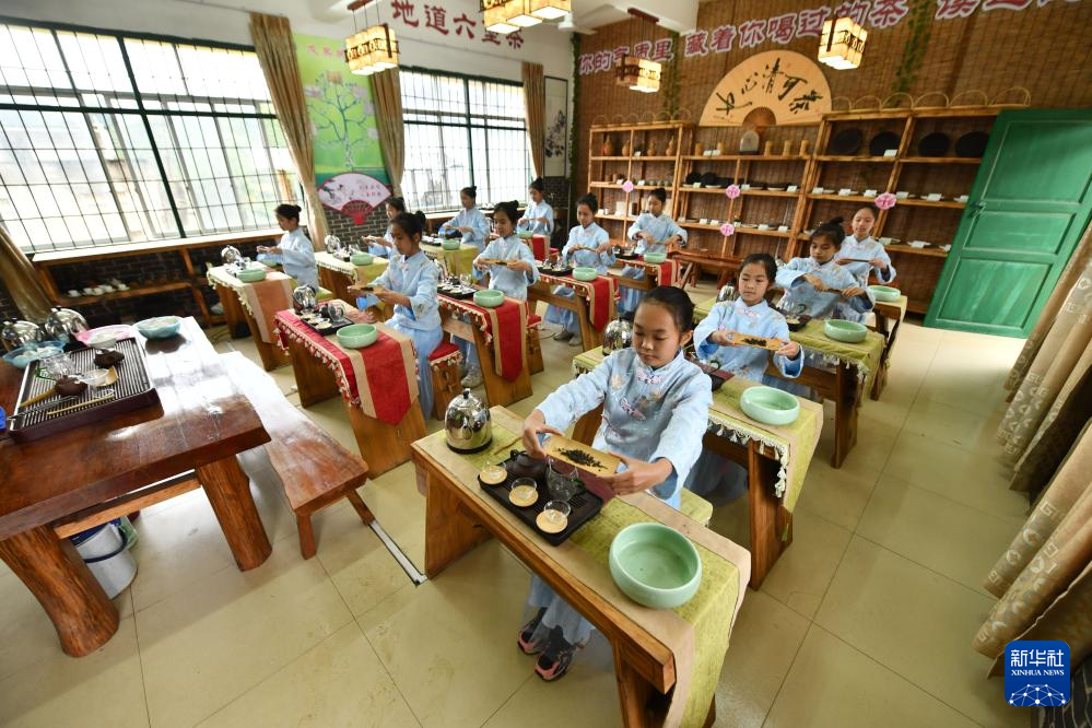 梧州市蒼梧縣六堡鎮中心校的小學生在學習茶藝(3月29日攝)。