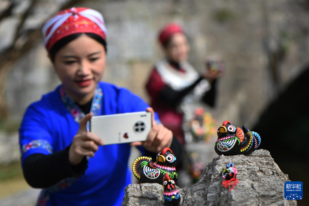 12月8日,在貴州省黔東南苗族侗族自治州黃平縣飛云崖景區,一名游客在拍攝手工制作的泥哨。
