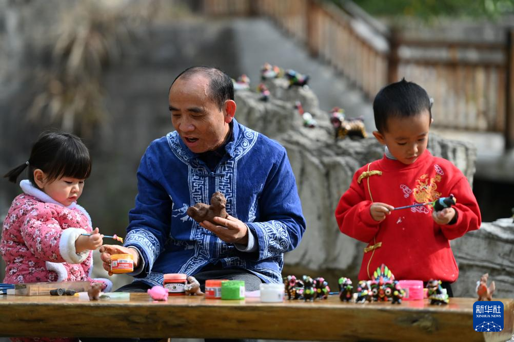 12月8日,在貴州省黔東南苗族侗族自治州黃平縣飛云崖景區,泥哨藝人在輔導小朋友制作泥哨。